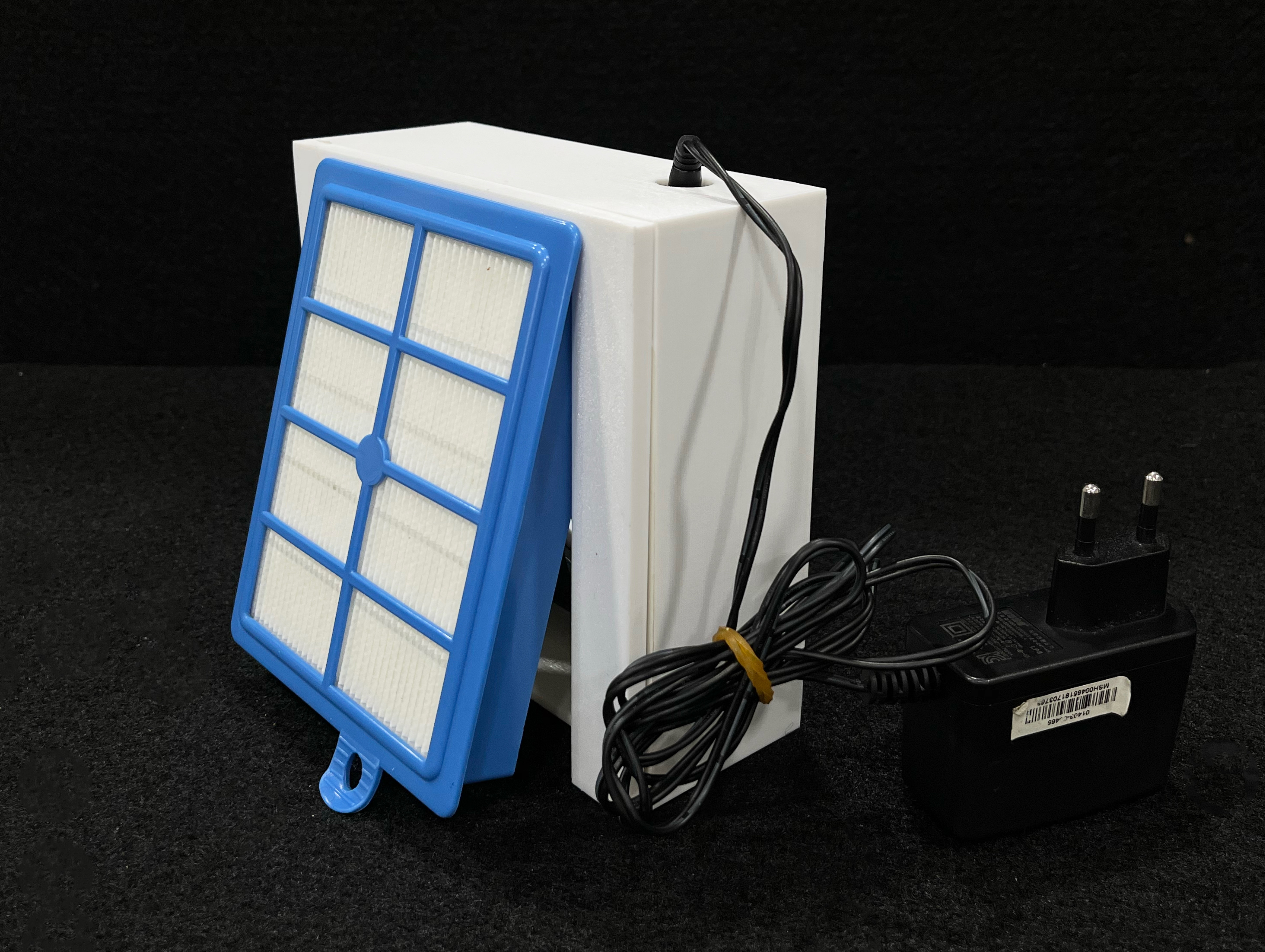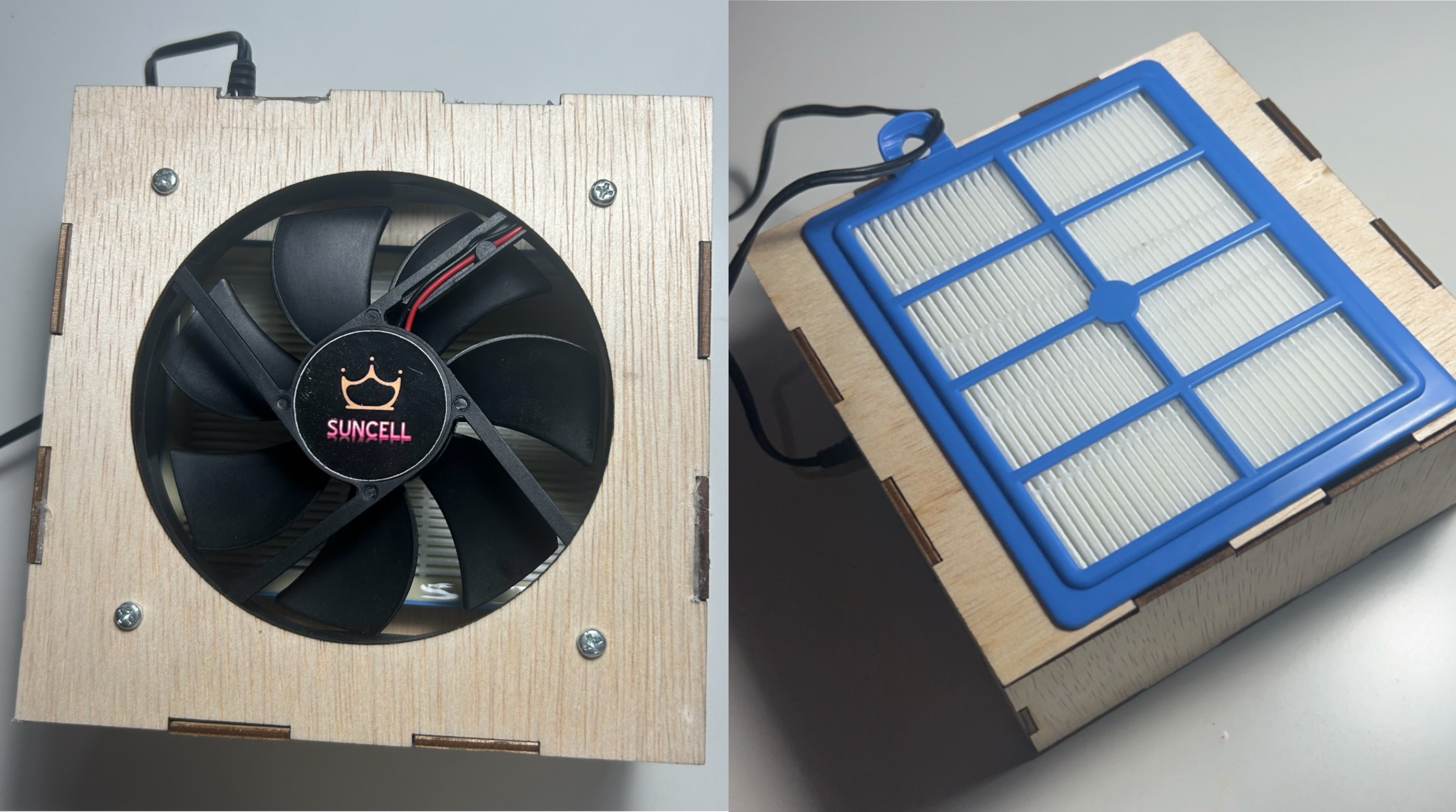 The work treats the original design as a starting point, not a ceiling. A MERV-13 filter at the back, a computer fan at the front, and a compressed 15.6 × 15.6 cm frame — airflow passes through the filter and is pushed outward by the fan's pressure, maintaining the original's far-reaching purification capacity at a fraction of its footprint.